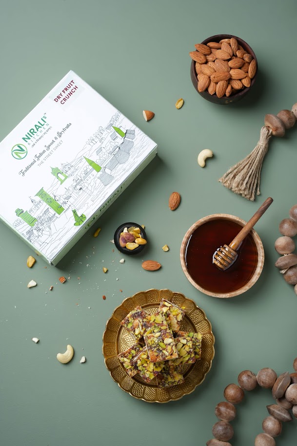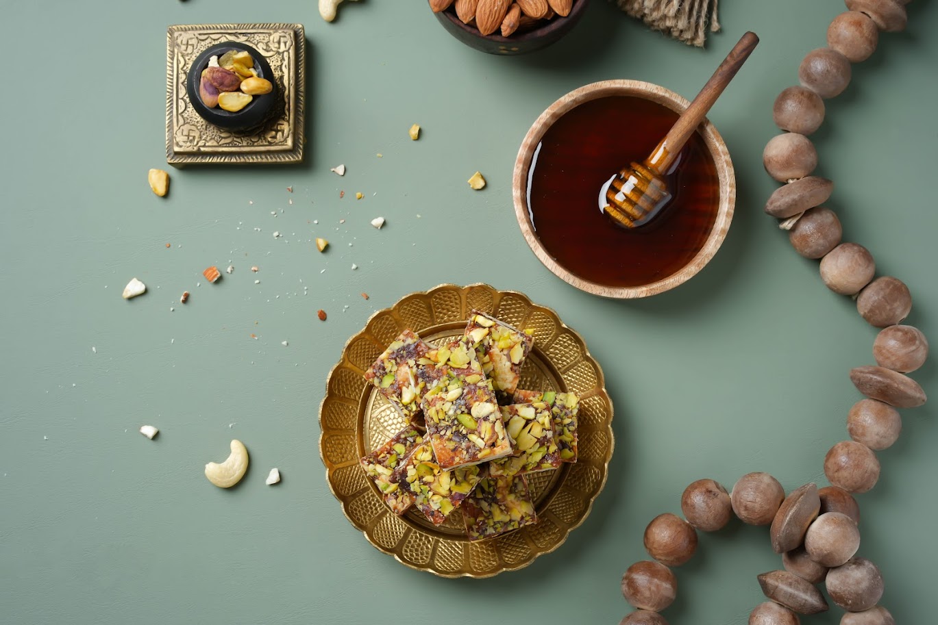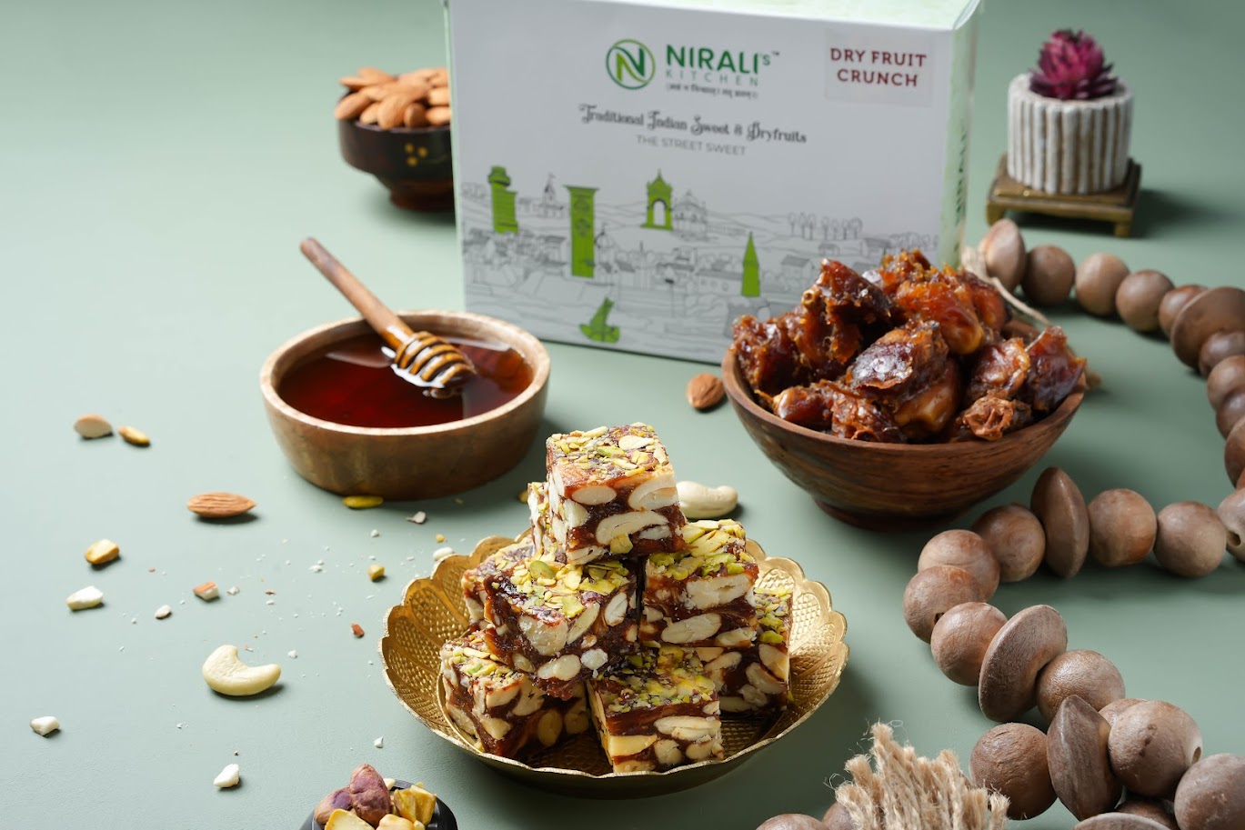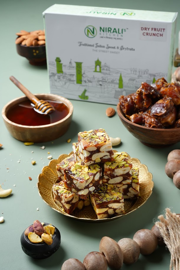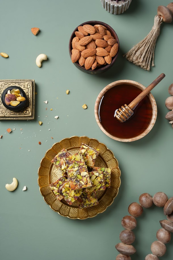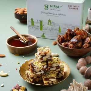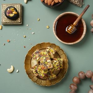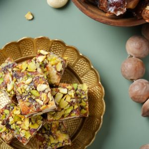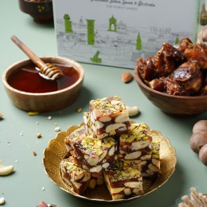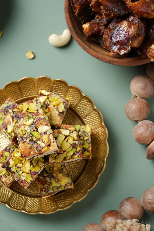A classic Khajur Pak made from premium dates, blended with crunchy cashews, almonds, and pistachios, and lightly bound with ghee or honey. These rich, square-cut pieces have a chewy texture with layered dry fruits, offering deep natural sweetness and nutty flavor in every bite.
